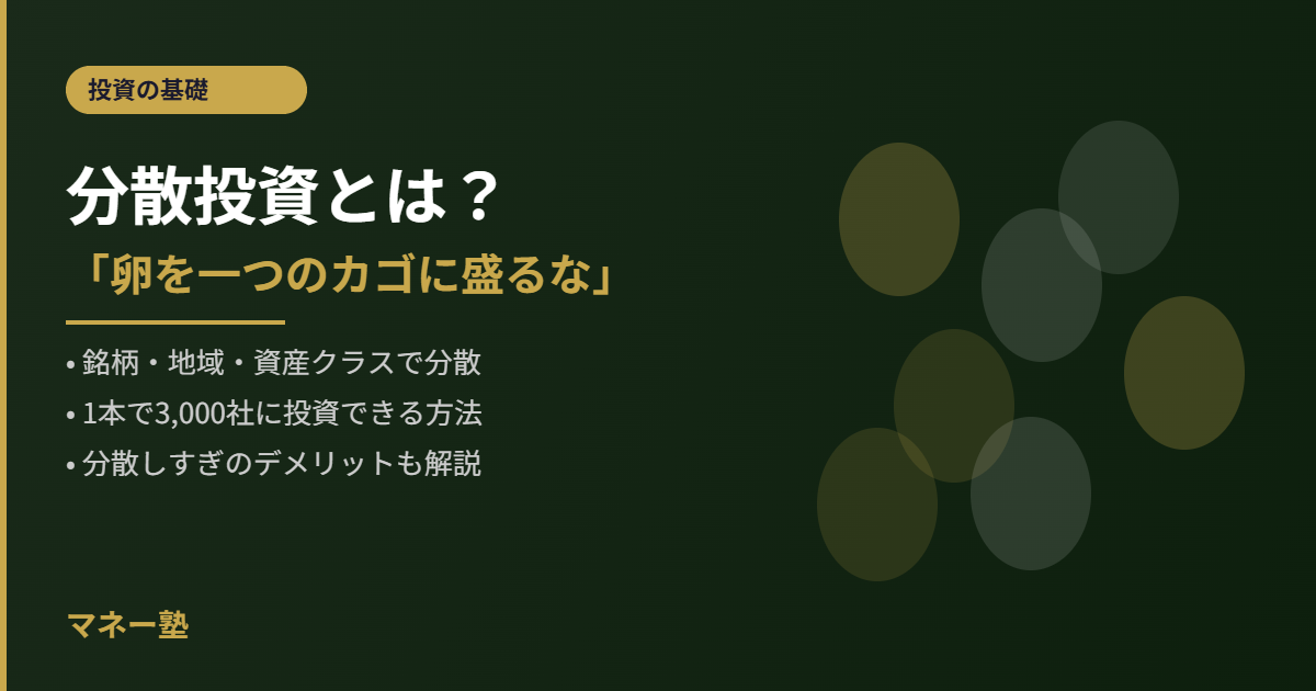 「卵を一つのカゴに盛るな」という格言を聞いたことはありますか?投資の世界で最も重要な考え方の一つが分散投資です。分散投資をするだけで、同じリターンを目指しながらリスクを大幅に下げることができます。
