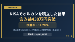 運用実績 NISAでオルカンを積立した結果|含み益430万円(損益率+37%)突破【運用公開スタート】 楽天証券のNISA口座でオルカン(eMAXIS Slim全世界株式)を運用中。2026年4月14日時点の運用実績を公開。含み益430万円突破の実態を包み隠さずお伝えします。 2026.04.15 運用実績
